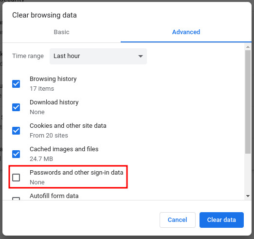 - Ensure “Passwords and other sign-in data” is Unchecked