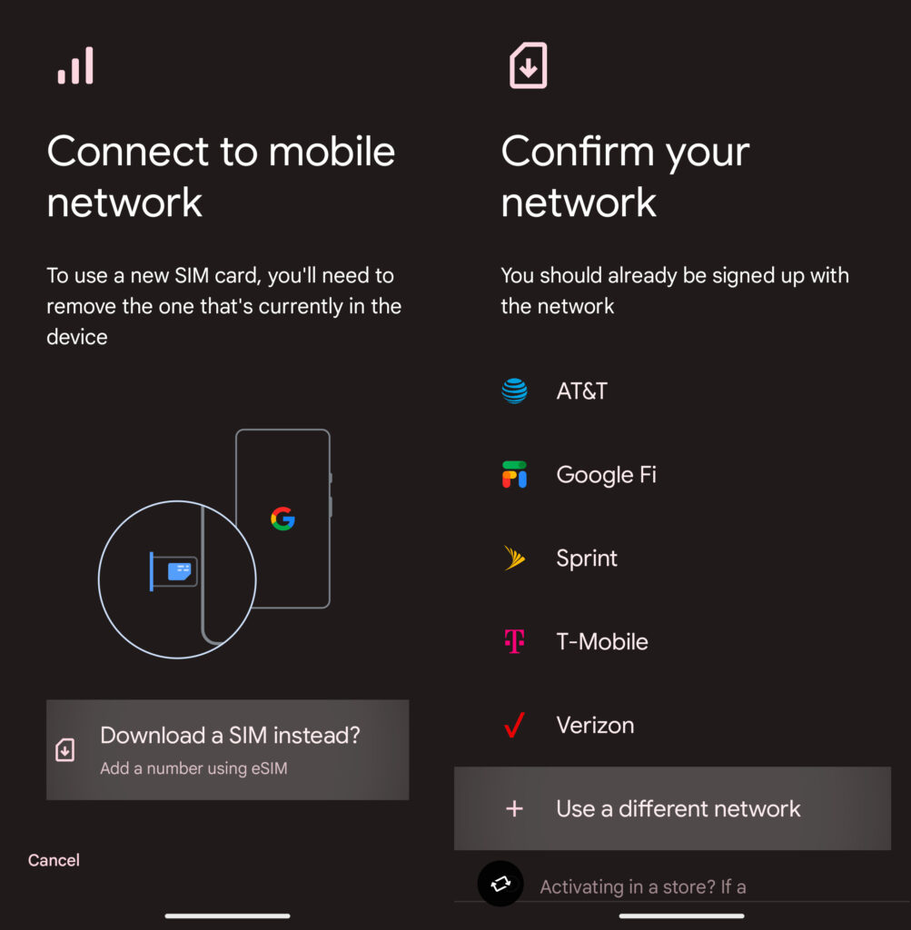 On the "Connect to mobile network" screen, at the bottom, tap "Download a SIM instead?" then click Next.