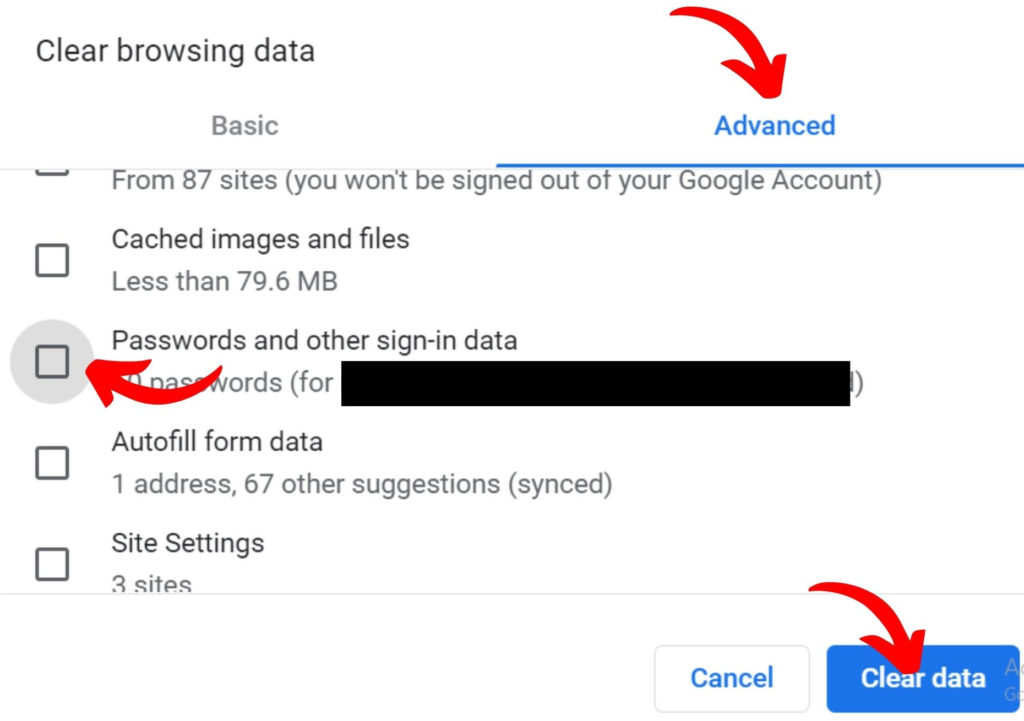 Step 6: Select Advanced at the top of the pop-up window and uncheck saved passwords, and clear data